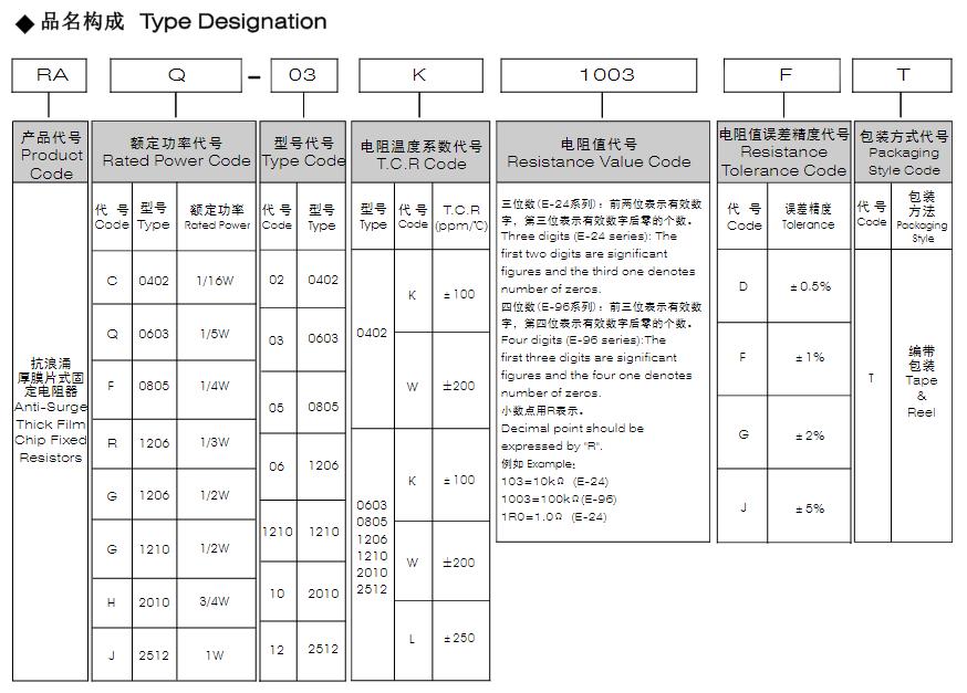 風(fēng)華抗浪涌厚膜片式固定電阻器型號(hào)命名規(guī)則: