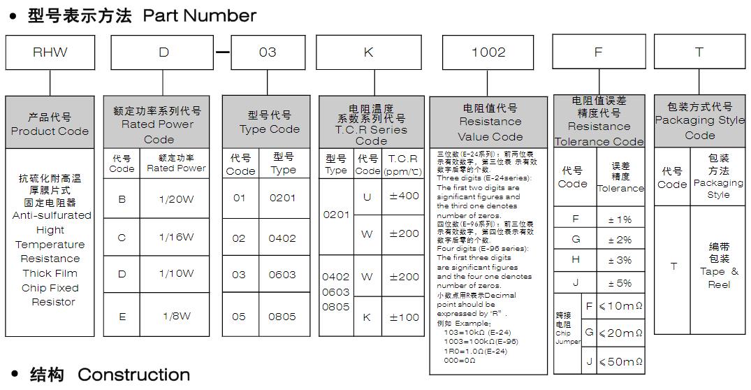 風(fēng)華高科抗硫化耐高溫厚膜片式固定電阻器型號(hào)命名規(guī)則: