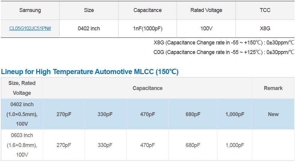 三星電機(jī)新品溫度補(bǔ)償用車(chē)載MLCC 150℃ 0402 1nF 100V