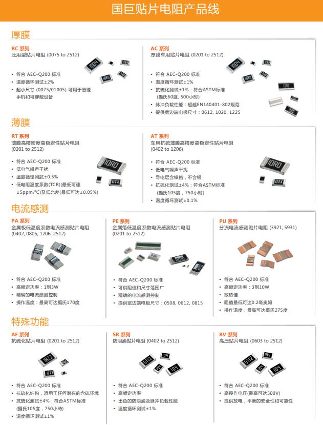 國巨是全球最大的貼片電阻供應(yīng)商之一,在汽車、工業(yè)、替代能源和消費電子等主要市場鄰域提供各種應(yīng)用。國巨提供完整貼片電阻產(chǎn)品系列,涵蓋汽車級金屬電流測電阻、精密薄膜電阻、厚膜防浪涌電阻、抗硫電阻、高功率電阻、高電壓電阻、排阻、小型010050075等,全方位解決方案。