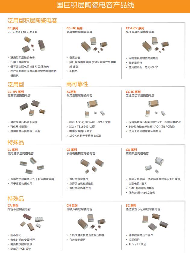 國巨的積層陶瓷電容為電路設(shè)計人員提供出色的性能、可靠性和成本優(yōu)勢。國巨提供多種類型的積層陶瓷電容(MLCC),包括一般品,高容,高壓,軟端和高頻。其中,高容MLCC是電容方面的高端產(chǎn)品,順應(yīng)電子行業(yè)朝向融合,多功能和小型化的趨勢。