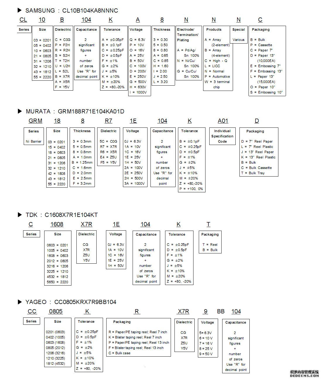 陶瓷貼片電容各大品牌命名規(guī)則: