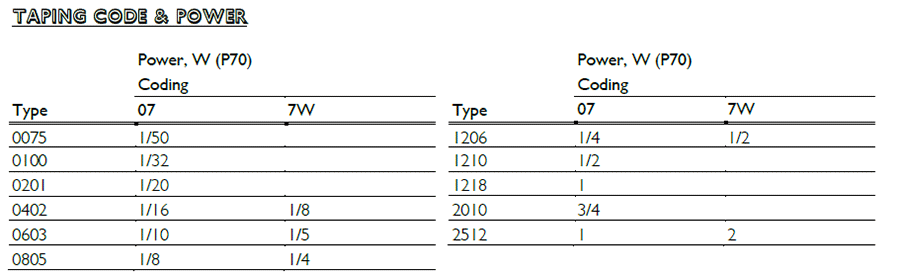 產(chǎn)品功率:1/50W;1/32W;1/20W;1/16W;1/10W;1/8W;1/5W;1/4W;1/2W;3/4W;1W;3W