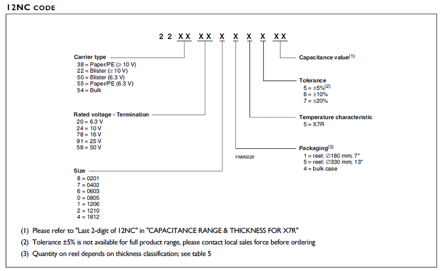 電容公差:J = ±5%、±10%(K)、±20%(M)