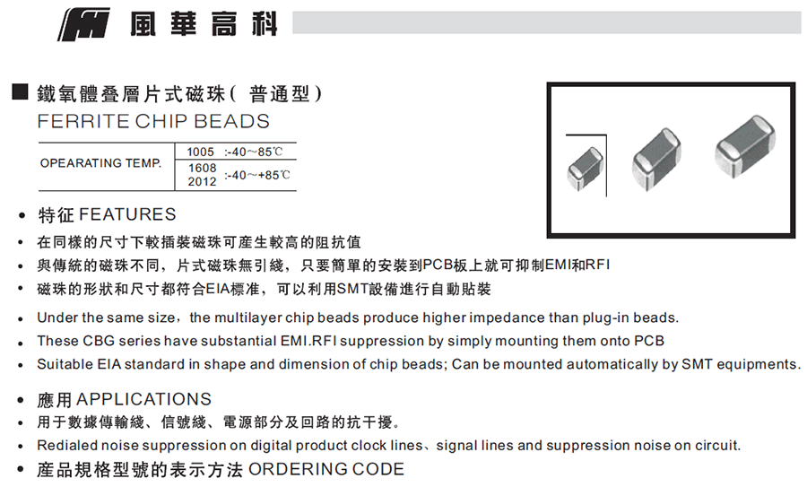 產品介紹:風華CBG鐵氧體片式普通型磁珠