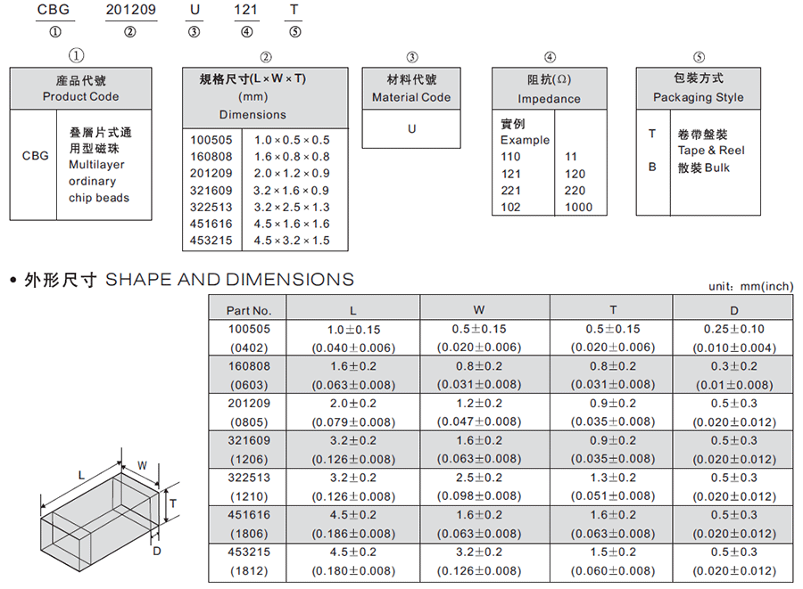 2、磁珠封裝尺寸:風(fēng)華貼片磁珠的封裝尺寸共有7個(gè),分別是:100505(0402),160808(0603),201209(0805)、321609(1206)、322513(1210),453215(1812)